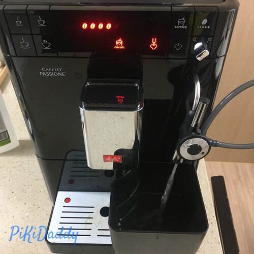 커피 배출구를 청소합니다. 물통의 용액을 일정량 소모하면서 여러번 청소를 합니다. 약 15분 걸립니다. 책이라도 읽습니다! ^^ 청소가 끝나면 조용히 자동으로 3단계로 넘어갑니다.