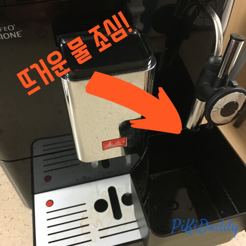 - 장시간 후에 전원을 켜면 자동 청소를 합니다. 이때 중앙 배출구에서 뜨거운 물이 배출됩니다. 버리는 물입니다.