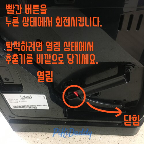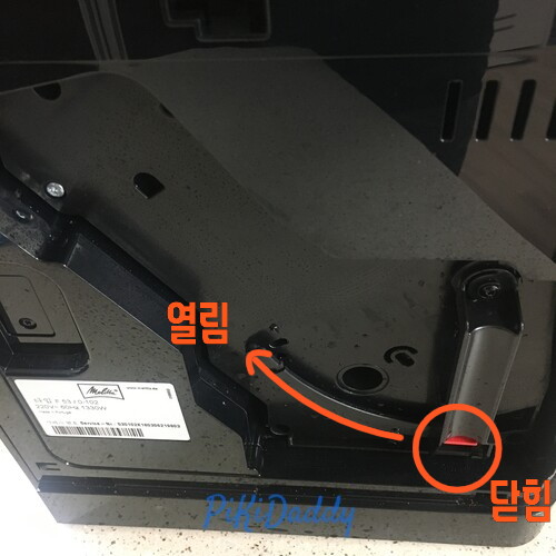 찌꺼기 통은 모양에 맞게 트레이 오른쪽에 집어넣고 트레이를 안쪽으로 밀어넣어주세요.